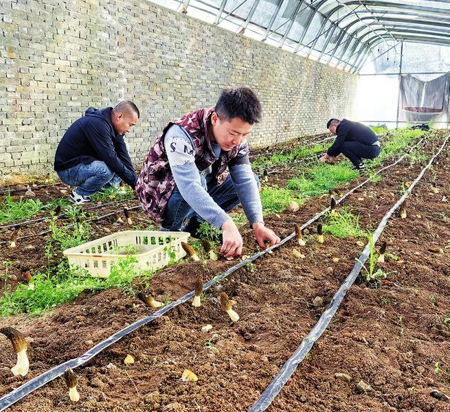 近年來(lái),平木村依托土地資源和氣候優(yōu)勢(shì),優(yōu)化產(chǎn)業(yè)結(jié)構(gòu)升級(jí),以“集體經(jīng)濟(jì)資產(chǎn)入股+固定分紅”模式,借助村集體經(jīng)濟(jì)溫室大棚招引種植能手,并拓寬基地種植范圍,大力發(fā)展羊肚菌種植產(chǎn)業(yè),帶動(dòng)村集體和村民增收致富!把蚨蔷N植周期短、效益高、見效快,冬季種植、春季采收,采收時(shí)節(jié)剛好與農(nóng)忙時(shí)節(jié)錯(cuò)開,既能提升土壤肥力,又能讓冬閑田向增收田轉(zhuǎn)變。同時(shí),我們實(shí)行菌蔬輪作種植模式,羊肚菌采收結(jié)束后,大棚內(nèi)又將輪種蔬菜,實(shí)現(xiàn)一地多收!逼侥敬妩h支部書記吳貴勤說(shuō),今年村上23個(gè)大棚共種植羊肚菌39畝,畝產(chǎn)可達(dá)350公斤,近期市場(chǎng)鮮貨每公斤200元左右,畝產(chǎn)值可達(dá)7萬(wàn)元。最近訂單不斷,羊肚菌大部分銷往廣東、四川、甘肅等地,每天采收100多公斤,供不應(yīng)求。