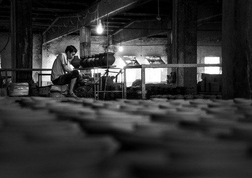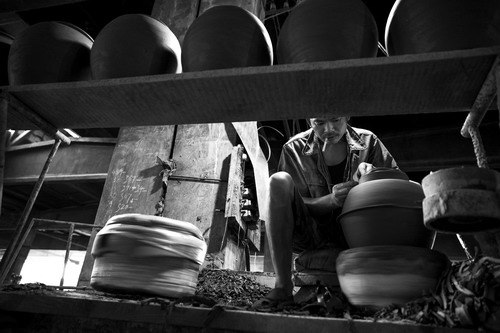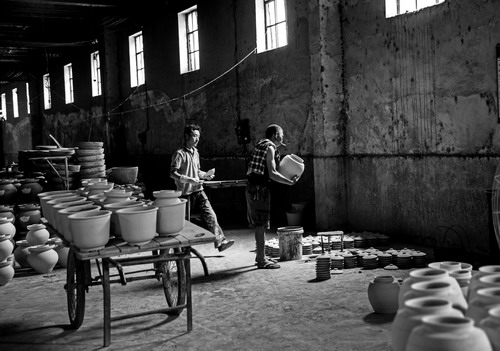 圖片說明:【陶場歲月】工業(yè)化的社會(huì),機(jī)器綁架著我們的生活飛速奔馳。在陜甘交界處,有一家手工陶瓷廠,你可以看到淘泥、摞泥、拉坯、印坯、修坯、捺水、畫坯、上釉、燒窯、成瓷、修補(bǔ)等完整的制陶工藝流程;廠里所有的陶工都沒有所謂的職稱,有的只是生活的艱辛和對自己所學(xué)技藝的堅(jiān)守。30年工齡的老楊說,觸摸的太多了,線條、比例、器型早就刻在心里了,無論多么相似,都能辨出其中的差異。無需言語,一切了然于心!拔易龅氖虑槠鋵(shí)很簡單,就是一份感情,一份執(zhí)著,雖然每個(gè)月只有千十元的收入,我會(huì)一直堅(jiān)守下去的,直到有一天干不動(dòng)為止。”